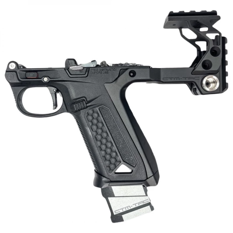 The manufacturing of this product is highly challenging, especially the body of the Reaper kit, which is machined from a solid block of aluminum using 5-axis precision CNC machining. This results in machining marks on the inner surfaces but ensures exceptional versatility when used with CTM magwell, magazine base plate, HPA adapter, and various red dot sights. The kit is also compatible with a range of aftermarket Picatinny stocks.